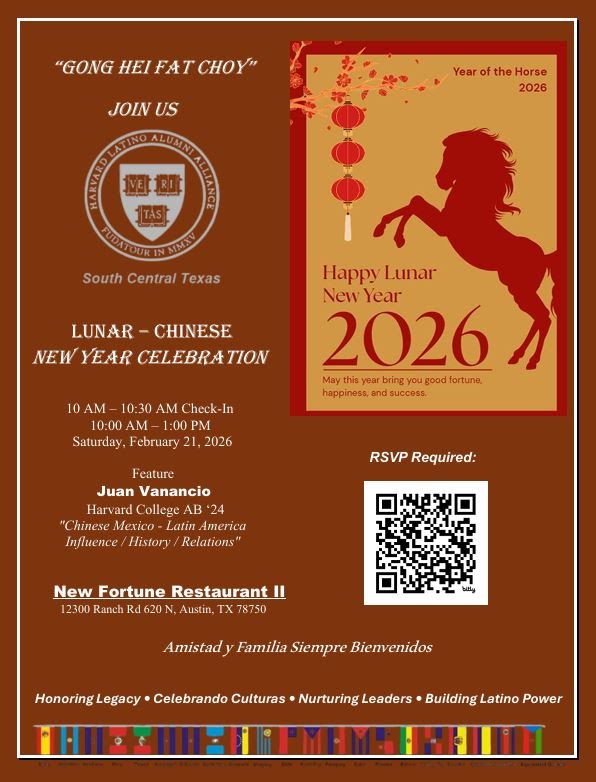 The Harvard Latino Alumni Alliance of South Central Texas invites any and all Harvard alums for a special Lunar New Year Dim-Sum Celebration at New Fortune Restaurant II in Austin. Juan Venancio, Harvard College AB '24 and HLAA-SCT member will share a reflective conversation regarding Chinese Mexico - Latin America influence, history, and relations
