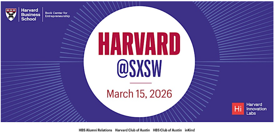 Join the Harvard Business School Rock Center for Entrepreneurship, Harvard Innovation Labs, and Harvard Business School Alumni Relations, in partnership with the Harvard Club of Austin and the HBS Club of Austin, for a special alumni reception during SXSW 2026.